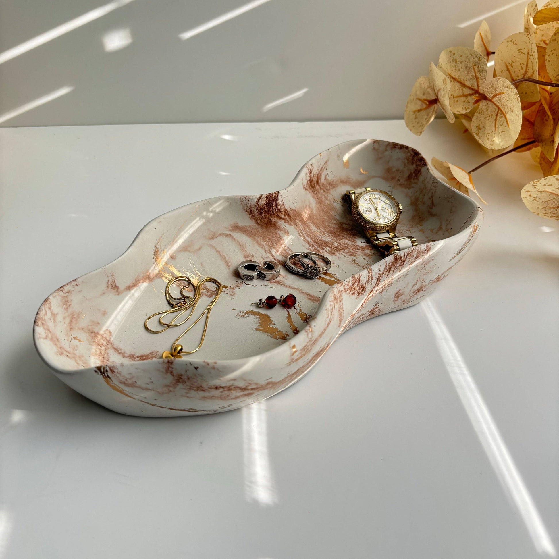 The concrete wavy-edged oblong tray/bowl is a sleek, sculptural piece that combines elegance with modern functionality. Its elongated, oblong shape is softened by gently undulating, wavy edges, creating a natural, flowing silhouette. Ideal for displaying decorative items or serving as a standalone centerpiece, this tray or bowl exudes a blend of sophistication and artistry, making it a versatile accent for any interior space. Measurements: Long 11” | Width 4.5” (widest point) | Height 1 7/8” | Deep 1 5/8” Each concrete item is handmade from scratch, as concrete is made from natural materials it has certain unique characteristics, or air bubbles may occur and are not considered a fault. Please notice as the concrete is poured in different batches there may be a slight variation in color and pattern they are inherit in concrete and should be expected. All items are cured and protected with a water resistant sealant, however they are not stainproof. Pads included.